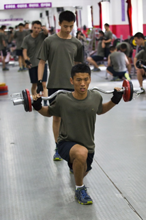 跑完8km,还有体能五项,举着杠铃跳起、障碍跑、原地跳绳、抬腿、俯卧撑。有的时候是加速冲刺跑训练,或是引体向上等一系列训练。