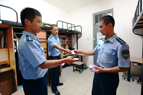 22:20,收学生卡。为了保证每位学员遵守军队纪律,每晚每人都需要上交自己的门禁卡。除了这些,平日里他们出校门需要打报告请假。