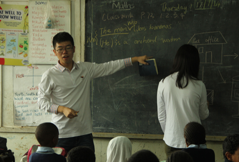图为“梦想学校”学生公益暑期联合实践支队对教师进行英语培训音标讲解。