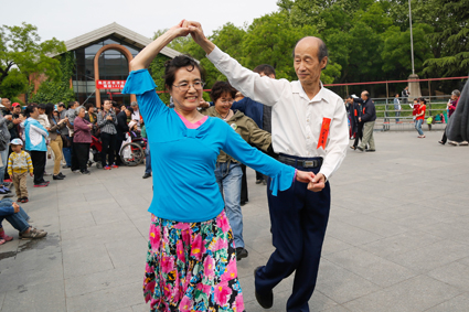 校友在礼堂前跳起广场舞