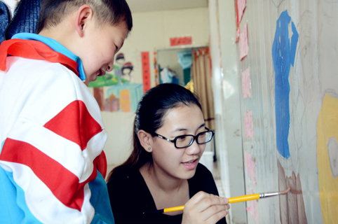 图为粉刷匠工作室同学为支教小学美化环境。