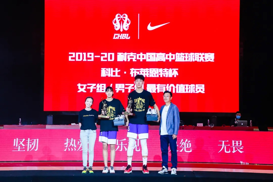 耐克大中华区篮球品牌市场部总监廖望(左一)、耐克中国体育市场部篮球总监张楠(右一)为2019-2020耐克中国高中篮球联赛女子组最有价值球员清华附中女篮9号李美潼(左二)、男子组最有价值球员清华附中男篮15号张陈治锋(右二)颁奖