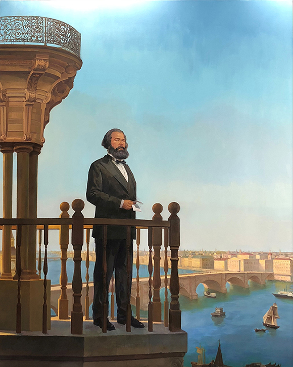 蔚蓝的天空下,马克思昂首挺胸地站在有罗马柱的阳台上,目光深邃,专注于驶进港口的邮轮,手中的纸张代替了初稿的书籍,更加突出了人物“遥望东方”的具体情节。根据考证,当时流亡伦敦的马克思只能通过《纽约每日论坛报》来获取世界各个国家的革命信息,以及有关中国第二次鸦片战争的情况,同时他也为报纸撰写了大量的革命文章以及传扬无产阶级的进步思想。马克思每日清晨在此等待《纽约每日论坛报》的情景成为一个历史的永恒。这是郑艺从繁杂的历史事件中剥离出来的美的瞬间。鲜活的气息,朴素的描写,真实的叙述,丝毫不掩人物的哲学高度以及革命精神。