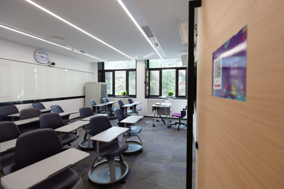 二段一层的阶梯教室里,白色与绿色隔行错落的座位与四周不同灰度的墙面相呼应,给予这间教室以极高的辨识度。