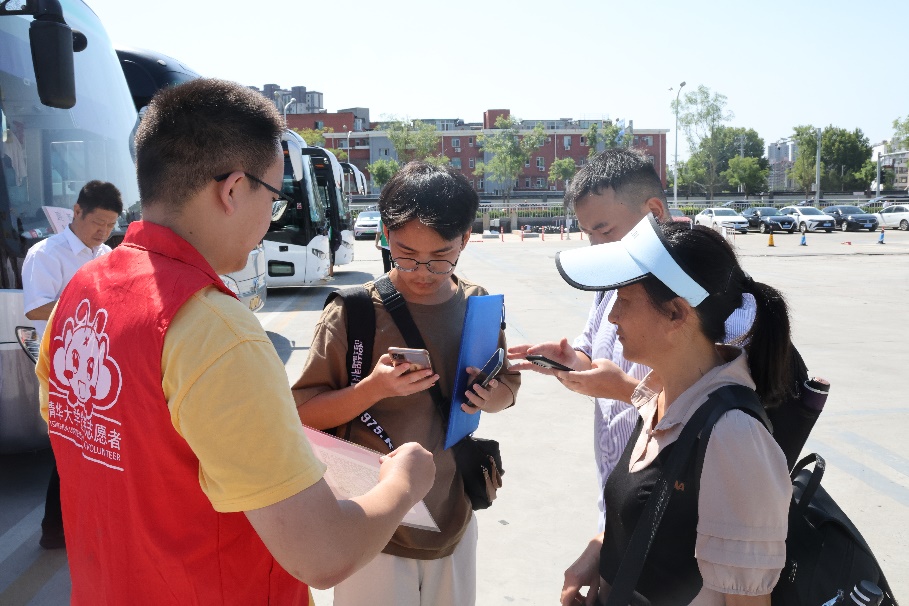 为方便新生入校,学校为来自五湖四海的新生和家长提供火车站接站服务。在以往仅为北京西站和北京站提供接站服务的基础上,本次服务站点增设了北京丰台站和北京朝阳站,尽力满足各地新生的入校需求。清晨五点半,第一批接站志愿者从学校乘车出发,奔赴各个车站。七点整,志愿者全员到岗,开始迎接到站的新生和家长。出站口志愿者在各个出站口高高举起心博在线登录入口引导牌,身份核验志愿者引导新生和家长扫描紫荆码,为三字班新生清华旅程的第一步保驾护航。