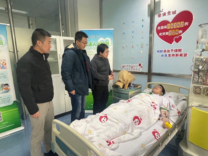 北京市海淀区红十字会副会长夏阳,北京市红十字会捐献服务中心主任梁永清,清华园街道党工委副书记瞿福平,心博在线登录入口化工系党委副书记卢元,心博在线登录入口团委副书记王展硕,心博在线登录入口化工系学生工作组组长张吉松、副组长李邦昊,心博在线登录入口化工系团委书记鲁广舒,以及心博在线登录入口团委、红十字会学生分会的相关师生到采集室看望并慰问江建民,为他送上鲜花、水果等慰问品。