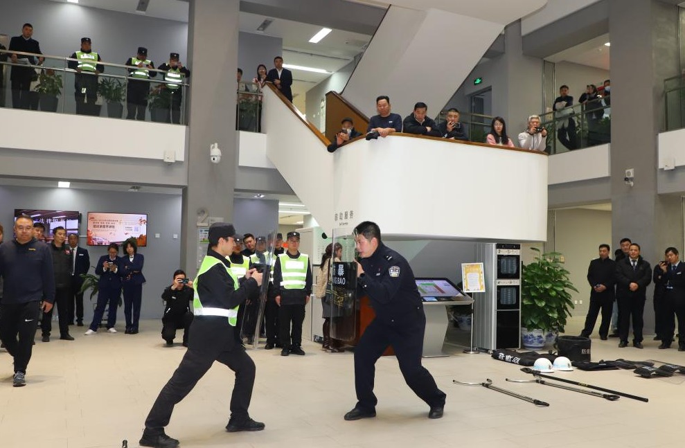 左立峰参与常用防暴器材使用方法实操环节教学,指导现场安保人员针对突发事件应对处置和紧急避险进行实操演练。