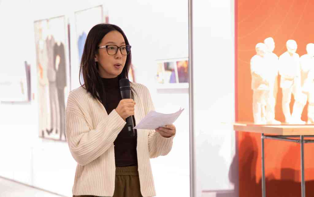 参展教师代表、美术学院副教授于婉莹分享了创作《我愿以身许国——向叶企孙先生及科学家致敬》作品的经历,希望借此向为国家、为民族默默奉献的科学家致敬,也更加明确了自己肩上的教书育人责任。
