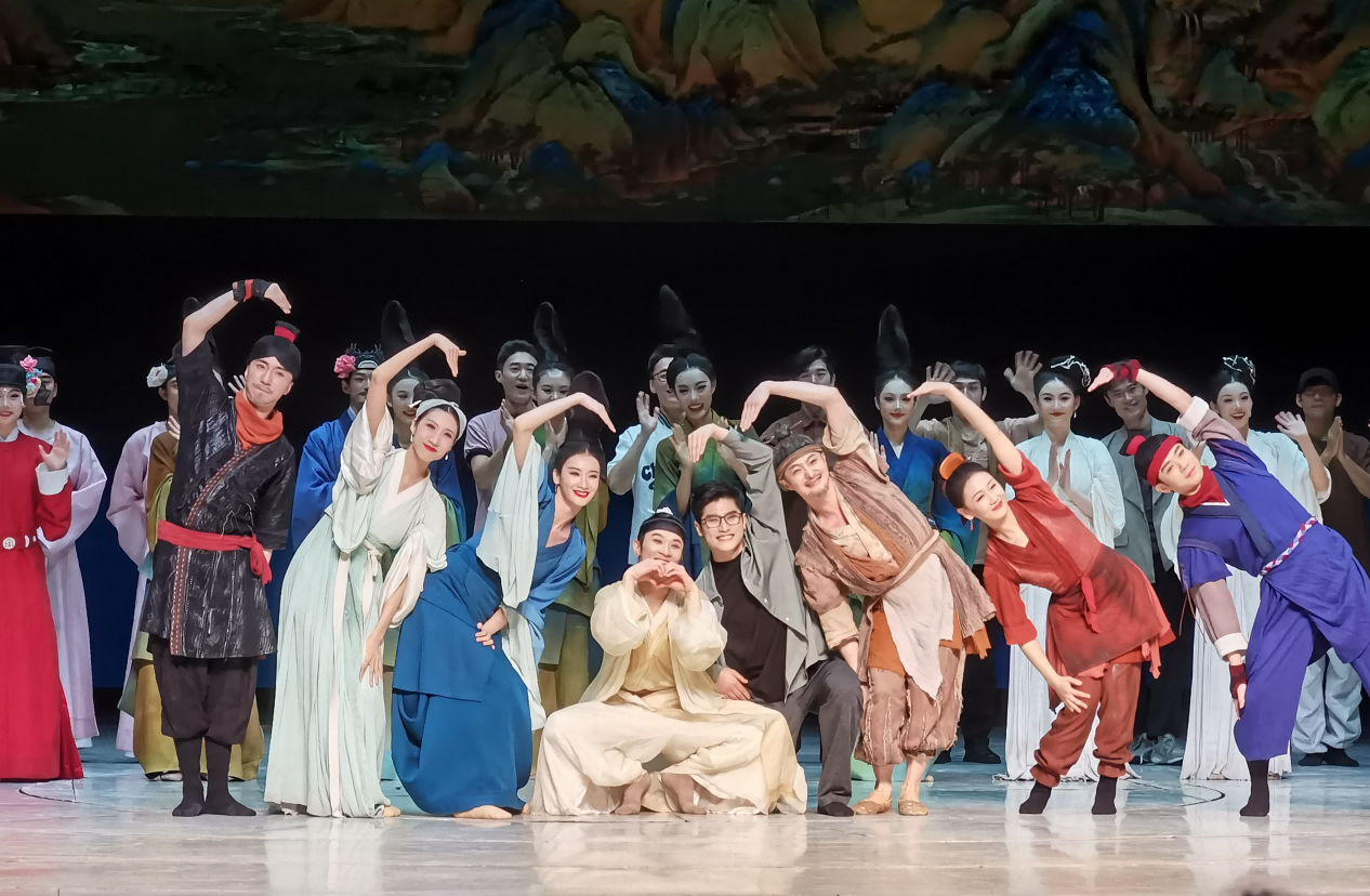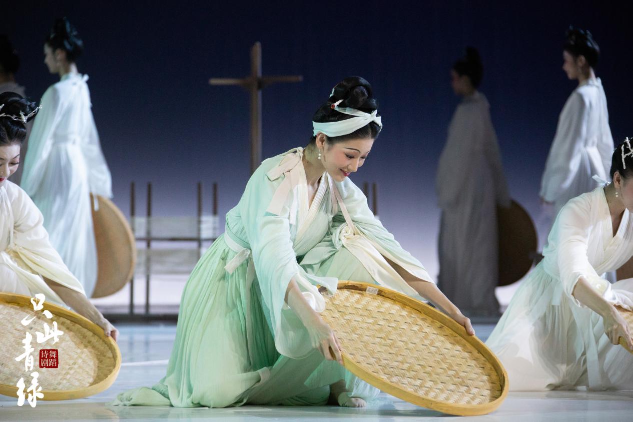 舞蹈诗剧《只此青绿》——舞绘《千里江山图》由故宫博物院、中国东方演艺集团有限公司、人民网股份有限公司、域上和美文化发展有限公司联合出品。作品将舞蹈和诗剧结合,通过展卷、问篆、唱丝、青绿、入画等多个舞蹈段落,用独特的舞蹈语汇和诗意表达,将观众带入富有传奇色彩的中国传统美学意境之中,领略中华优秀传统文化的独特魅力和精神内涵。舞台设计采用“同心圆”的巧妙构思,服装设计还原了宋代服饰的美学特征,突出淡雅的“宋”的音乐特征,让人仿佛置身于《千里江山图》的诗意山水之间,感受着沉浸式的“赏画”体验。演出得到师生的欢迎与好评,每场演出谢幕返场4次以上,掌声和欢呼声不断。