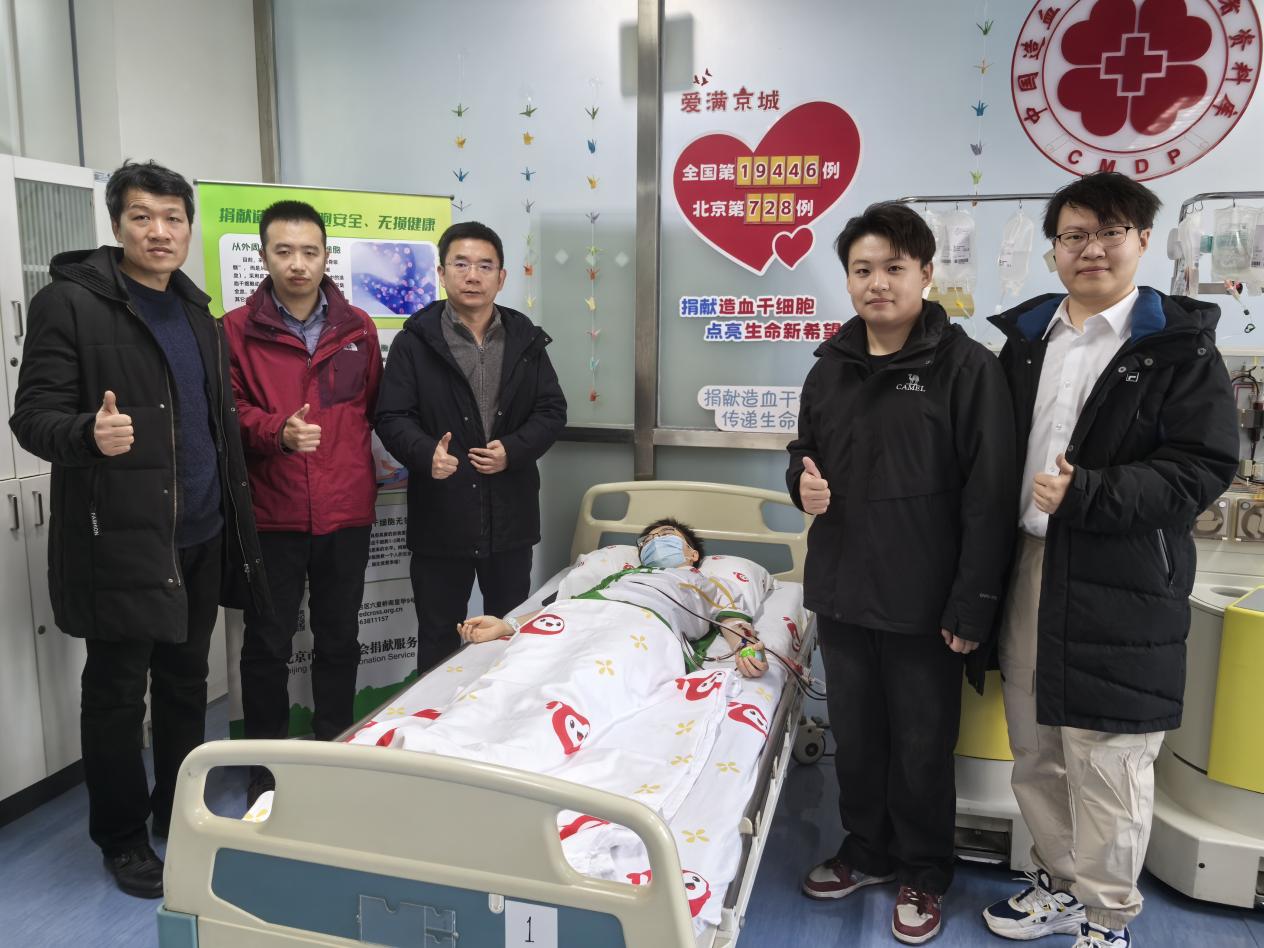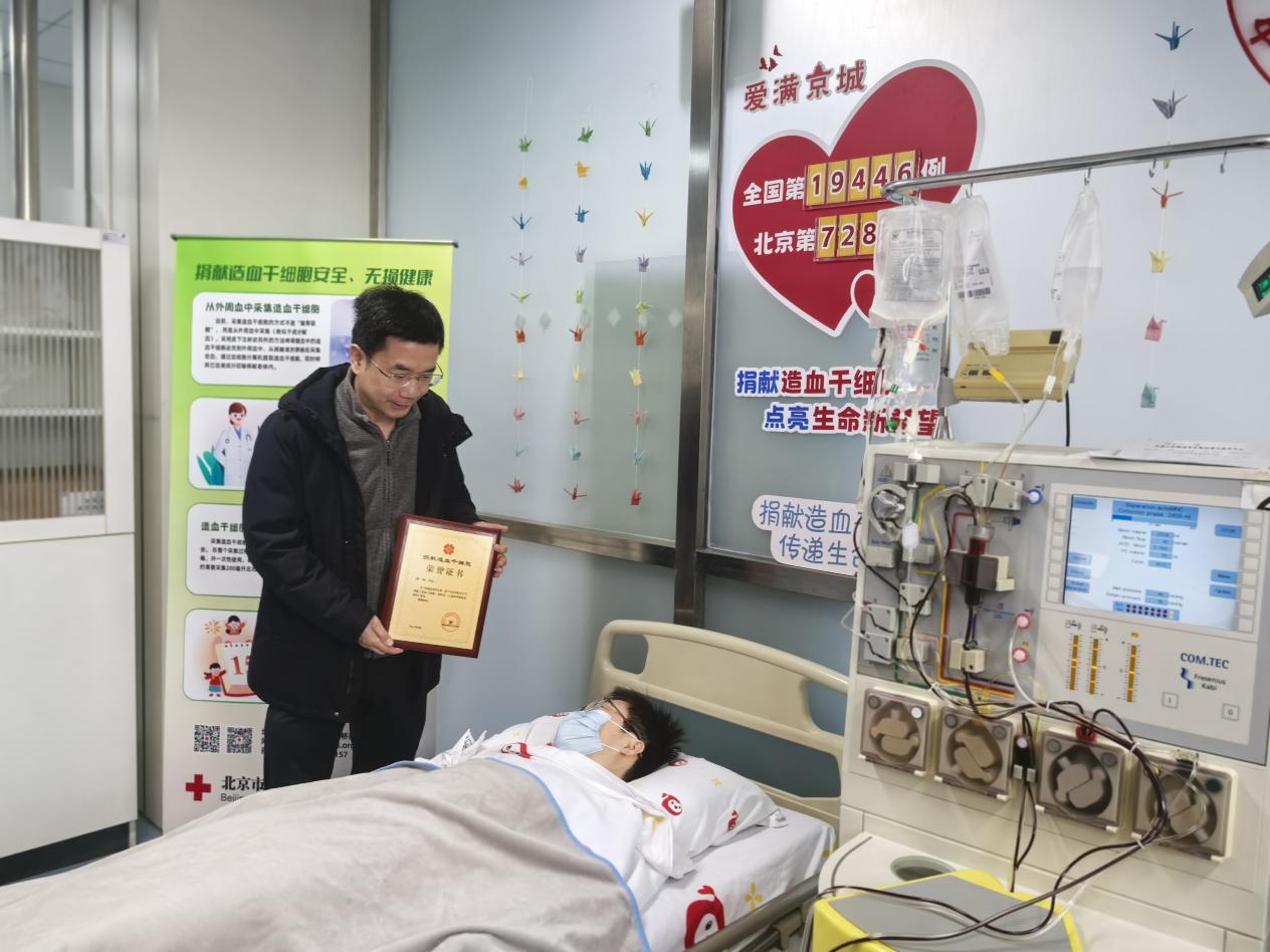 北京市红十字会党组成员、副会长李小源,北京市红十字会捐献服务中心主任孙晔,清华园街道办事处副主任方仲奇以及心博在线登录入口航天航空学院党委书记陈海昕、党委学生组组长姜辰、航11班班主任吕存景等师生代表到采集室慰问薛晗,为她送上鲜花、牛奶等慰问品。