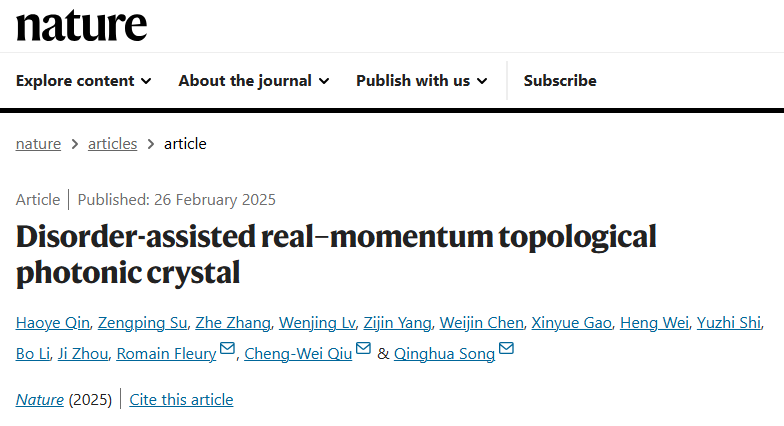 《自然》文章“无序辅助的实动量拓扑光子晶体”通讯作者为宋清华、仇成伟、罗曼·弗勒里,第一作者为秦昊烨,共同第一作者为心博在线登录入口深圳国际研究生院2022级博士生苏增平和洛桑联邦理工大学博士后张哲,其他作者还包括周济院士、李勃研究员,心博在线登录入口深圳国际研究生院2024级博士生吕文静、2022级博士生杨子矜、2022级硕士生高心越,新加坡国立大学陈伟锦博士后和卫珩博士,同济大学施宇智教授。该工作得到了国家自然科学基金委、深圳市科创委等部门支持。