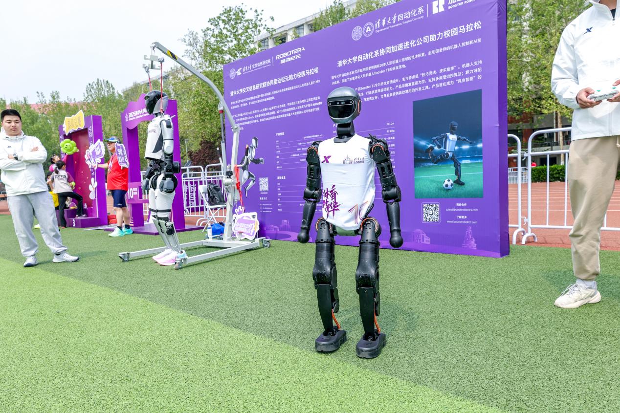 来自清华交叉信息研究院和自动化系的AI智能机器人,携手灵动可爱的机器狗,以科技力量为赛事添彩,竞技氛围融入别样的“智能温情”。校园马拉松十周年庆祝环节,清华附小师生代表、教职工及学生运动员代表,与比赛当天过生日的九位跑者一起登台,回顾十年时光、许下未来展望。