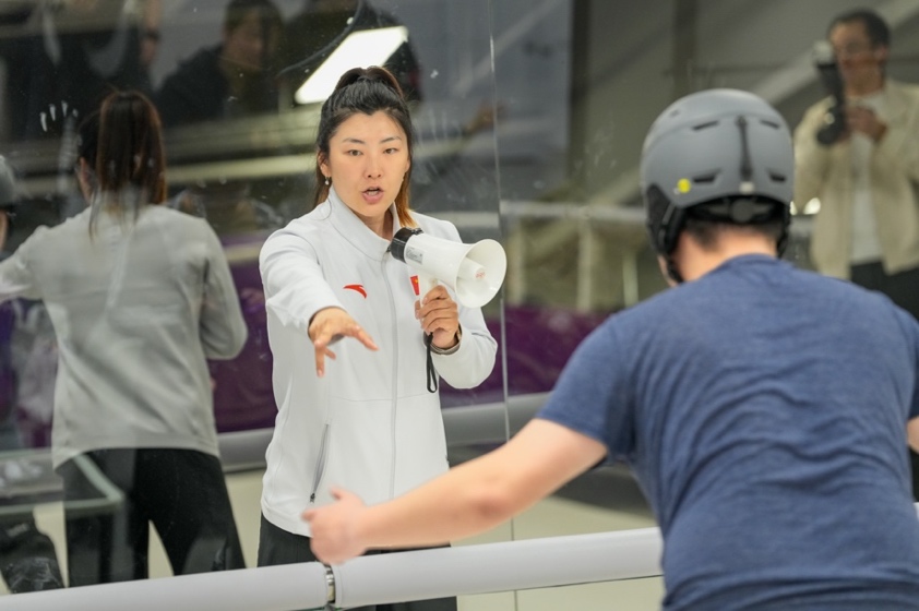 在北体育馆互动训练环节,徐梦桃示范专业热身技巧,带领大家进行集体热身,强调科学热身对运动安全的重要性。随后,徐梦桃指导同学进行陆上滑雪机实操练习。徐梦桃结合自身训练经验,逐一纠正动作细节,让“无体育,不清华”的激情随冰雪跃动。