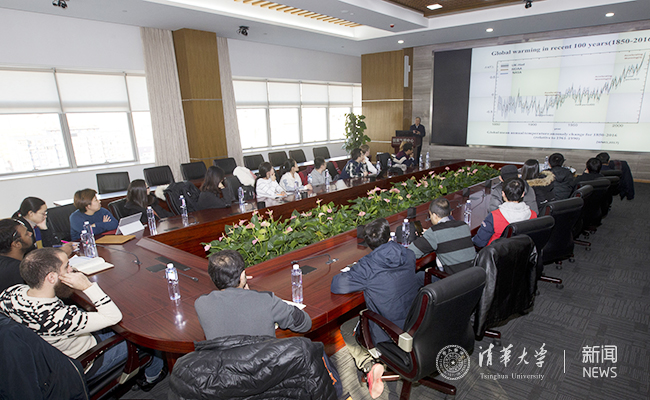 随后,在与气象局专家的座谈会中,中国气象局气候变化特别顾问、中国工程院院士丁一汇为同学们做了题为“全球气候变化带来的风险与可持续发展(The Increasing Risks of Global Climate Change and Sustainable Governance)”的英文报告。报告系统地介绍了中国气象局的主要职能和工作,包括气象灾害监控和预报、重大活动的气象保障、气象技术支持方面等,以及中国第六次气候变化绿皮书的相关内容。