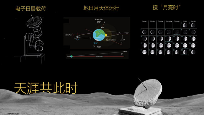 “海上生明月,天涯共此时。”明月为不能“共处一地”的人们提供了能够“共处一时”的情感寄托。方案“天涯共此时”是一个现代版的“日晷”,它搭乘嫦娥探月着陆器,以月球表面为天文观测点,为地球上的人们提供“月亮时”。它在“地月互动”的过程中寄托人们的情感,传播天文知识,真正实现“天涯共此时”。