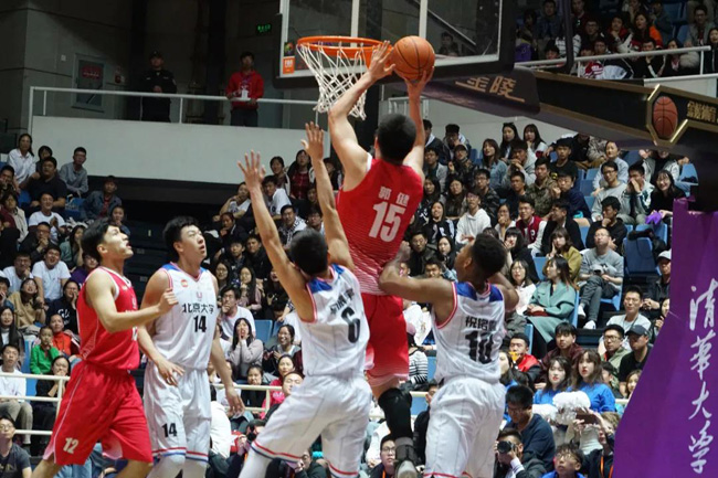 下半场开战,郭健继续展示出在篮下的统治力,清华男篮在进攻端也更为顺畅,本节过半将比分拉开至两位数。全场的“防守”呐喊持续不断,本节后段,北京大学依靠主力球员发挥将比分缩至3分,55:52,清华手握3分优势进入决胜局。