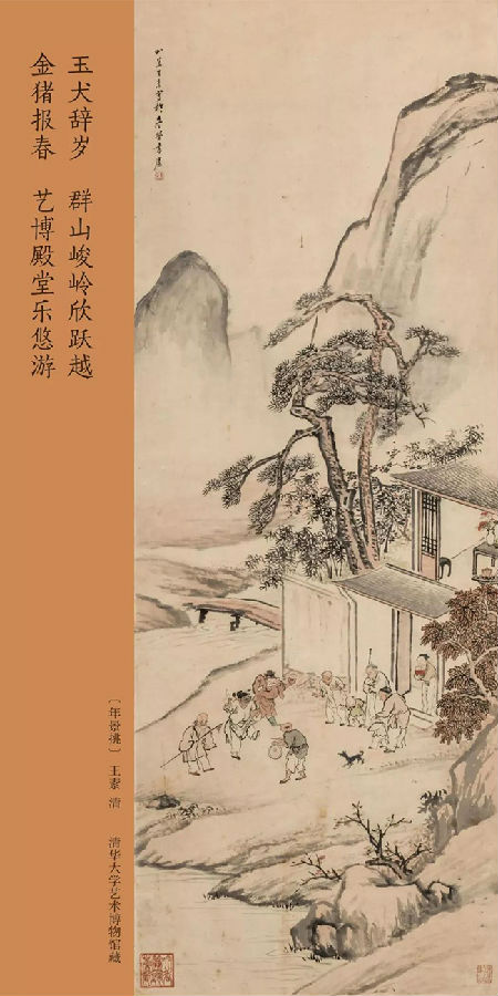 作品描述:此处之“挑”,大约是“挑达”之意。《诗 郑风 子衿》:“挑兮达兮,在城关兮”。传:“挑达,往来相见貌”。朱熹《集传》则称:“挑,轻儇跳跃之貌。达,放恣也。”作品称“年景挑”,大约是民间年初纵舞欢跳、祁望美好年景的风俗。作品描绘了山脚一户农家院落前歌舞欢跳的场景。画中共11人,其中专司挑达者4人,有化妆成“福禄寿”三星跳跃的,有敲锣伴奏的;门前为一家老小5人,另一妇人怀抱婴儿从门中探身观望。此“年景挑”带有跳傩的性质,有驱邪迎福之意。从题目上看,作品可以称为一幅风俗画。但画面所表现的内容又是一幅山水作品,此作有明代袁尚统风格,属节令吉祥画。作品风格简洁清秀,山脚、坡岸的皴染用简练的笔法写就,院中的松树、修竹描绘得较细腻,意境平和静谧。
