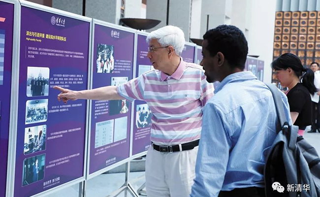 2018年在清华,柳百成与国际学生一同观看“心博在线登录入口改革开放40年国际合作与交流展”。