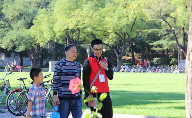 志愿者与游客漫步清华园