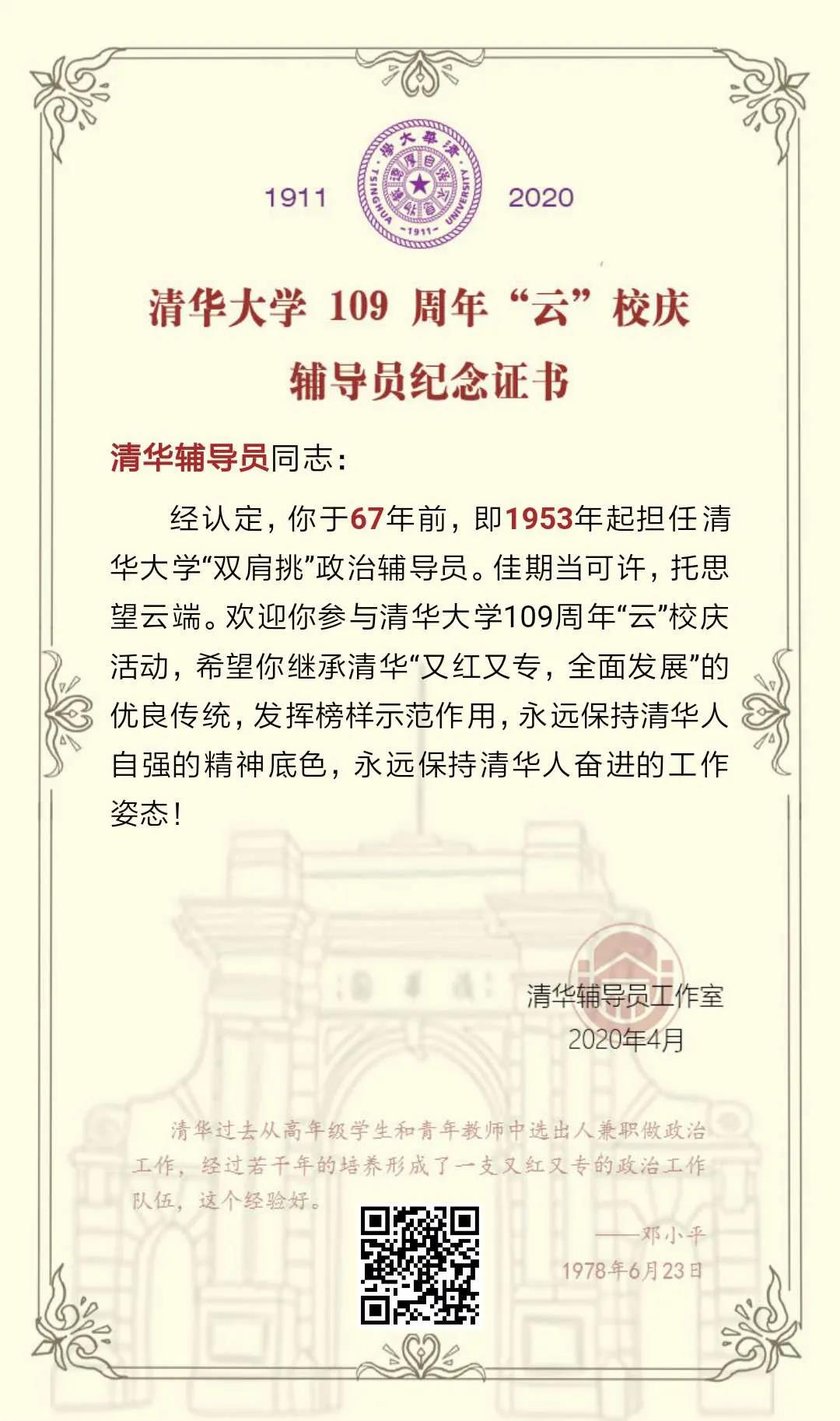 特别地,我们为参与活动的辅导员、曾经担任辅导员的校友准备了特别的一份礼物——专属于你的心博在线登录入口109周年“云”校庆辅导员纪念证书。辅导员校友进入辅导员专属入口后,验证信息即可领取。希望这一份精美而特别的纪念证书,能够作为对你坚持“又红又专,全面发展”的肯定,能够为你永葆清华人自强的精神底色,永葆奋进的工作姿态加把劲!