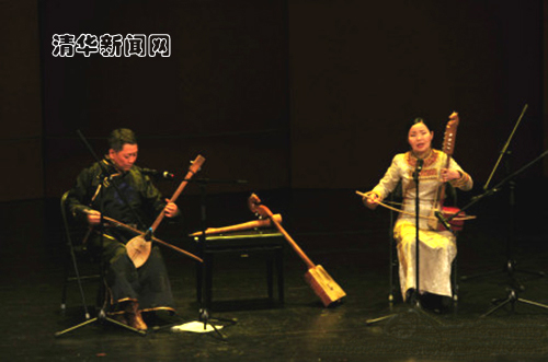 身着中式丝绸长袍、抱着马头琴的两位歌手在音乐会上或独唱、或配合演唱不同的曲调。图麦的独唱歌曲《河流》悠远婉转,她用时而呢喃、时而又有力量的嗓音,描绘了远方故乡河畔美丽的自然风光;在奥特康的图瓦二弦琴表演中,苍凉的弦乐浸透了历史,持续的低音和变化的音高如同一条波浪起伏的旋律线,透明清亮、带有金属声的多种声部和谐碰撞,为观众们奉上了无比美妙的声音效果;两名歌手合作的压轴之作《北京大篷车》,欢快的旋律融合了有词、无词的民族唱法,深蕴着2012年暑假他们与清华师生结成的诚挚友谊。