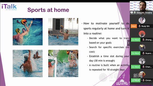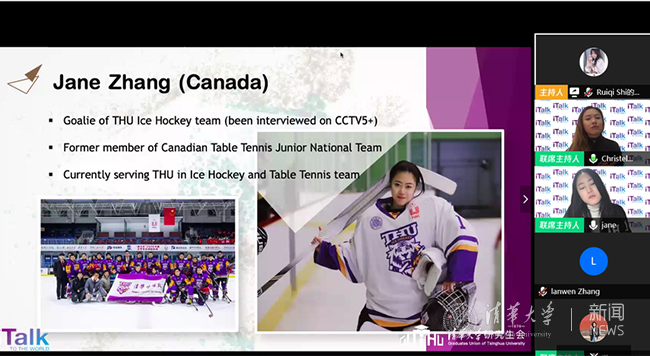 首页网3月17日电(通讯员 王方)3月15日晚,第24期iTalk暨首期“云上iTalk”如期举行,吸引了90余名清华学子与活动嘉宾云上畅聊。iTalk是由心博在线登录入口研究生会搭建的英文交流平台,本期iTalk以“无体育,不清华:清华人的体育人生(Inside the Sports Life of THUers)”为主题,邀请了四位分别来自葡萄牙、加拿大、秘鲁和中国的清华体育名将分享他们探索运动、坚持运动并爱上运动的体育故事。