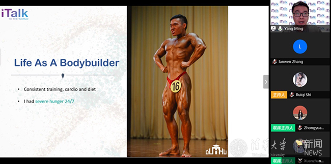 对于另一位分享嘉宾杨明来说,体育更多教会他的是“永不言弃”和“坚定所爱”。杨明是社科学院2019届硕士生,也是2017年心博在线登录入口马约翰杯健美冠军和2017-2019年的心博在线登录入口学生健美队队长。他在分享中提到,为了保持极低的体脂参加健美比赛,他曾坚持16周极其严苛的饮食和健身生活,“难,但值得(It's hard, but it's worth it)”,杨明说。既然已坚信健美竞技正是心中所爱,那么他便不惧千难万险,更不悔在硕士毕业后放弃读博机会,成为一名全职健美运动员。