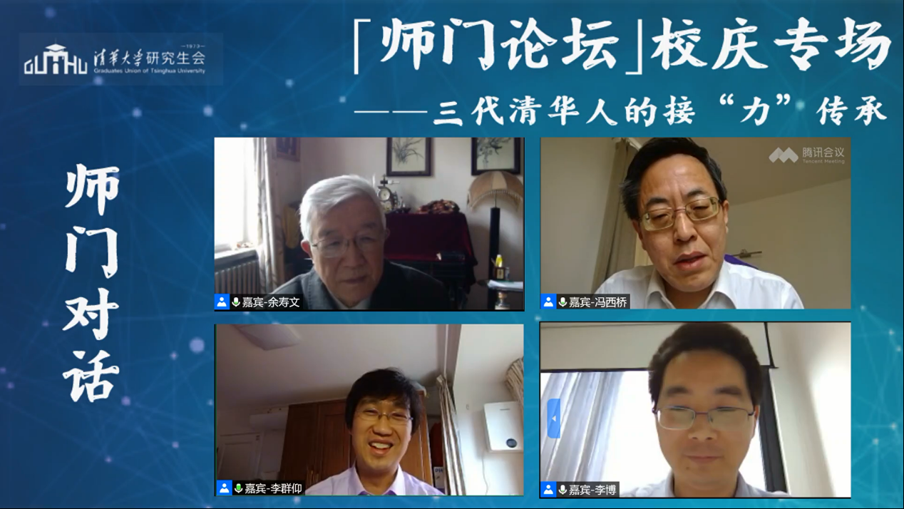 首页网4月29日电(通讯员 陈明 李艳文 张健辉 杨纪显)4月25日下午,在心博在线登录入口109周年“云校庆”之际,主题为“三代清华人的接‘力’传承”的校庆专场“师门论坛”顺利举办。本场论坛邀请了心博在线登录入口原副校长、研究生院原院长、航天航空学院教授余寿文教授作为特邀嘉宾,航院冯西桥教授、李群仰教授、李博副教授作为师门对话嘉宾出席。近400名来自校内各个院系的师生和校友线上参加本次论坛。