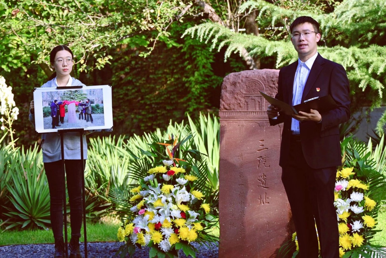 黄京磊在“三院遗址·清华第一个中共支部诞生地”纪念碑前进行宣讲。他详细阐述了三院的变迁历史——作为最早的一批校园建筑,三院承载了冯友兰、朱自清、闻一多等名人大师的求学任教过程,也在1926年11月见证了清华第一个党支部的诞生。在此基础上,黄京磊回顾了清华党组织不断发展壮大、为寻求民族解放和人民幸福而不断斗争的过程。他在宣讲中表示,三院是我们心中的一座丰碑,清华精神也将永远照耀我们前行的道路。
