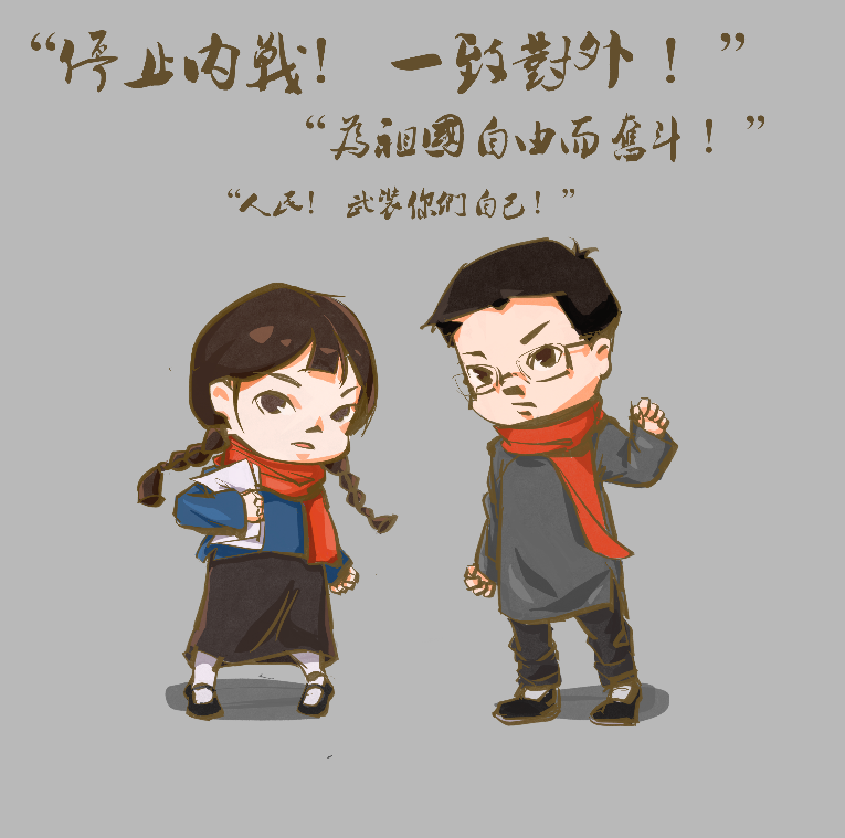 在形象设计作品中,美术学院2019级本科生赵晓晓所设计的动漫形象广受好评。该动漫形象再现了“一二·九”时期热血爱国青年的风貌,从动作、神态等方面着重体现其坚毅不屈、刚正果决的精神。作品中人物的红色围巾暗示着青年学子与祖国之间的密切联系,展现青年们保卫祖国的勇气与决心。