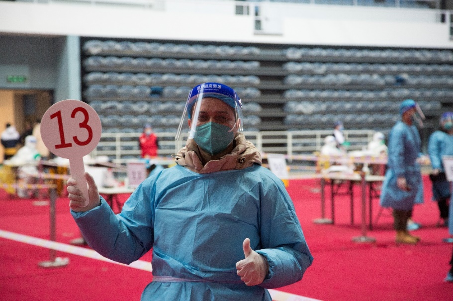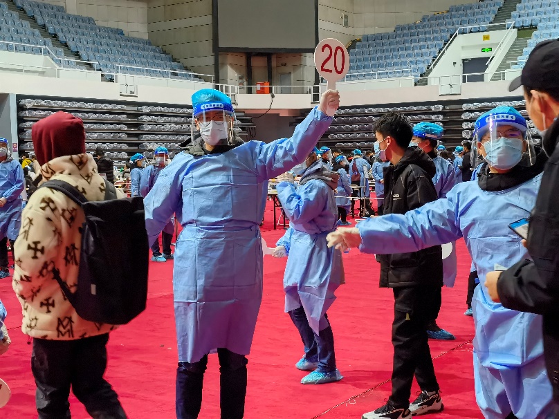 在西体育馆参与疫苗接种的医护人员和志愿者
