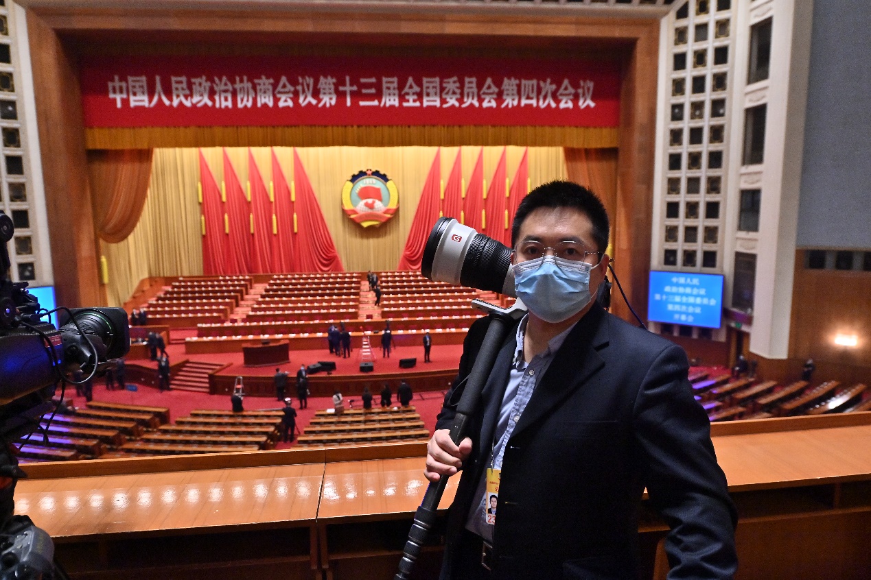 2021年两会期间,邢广利在人民大会堂门口的工作照