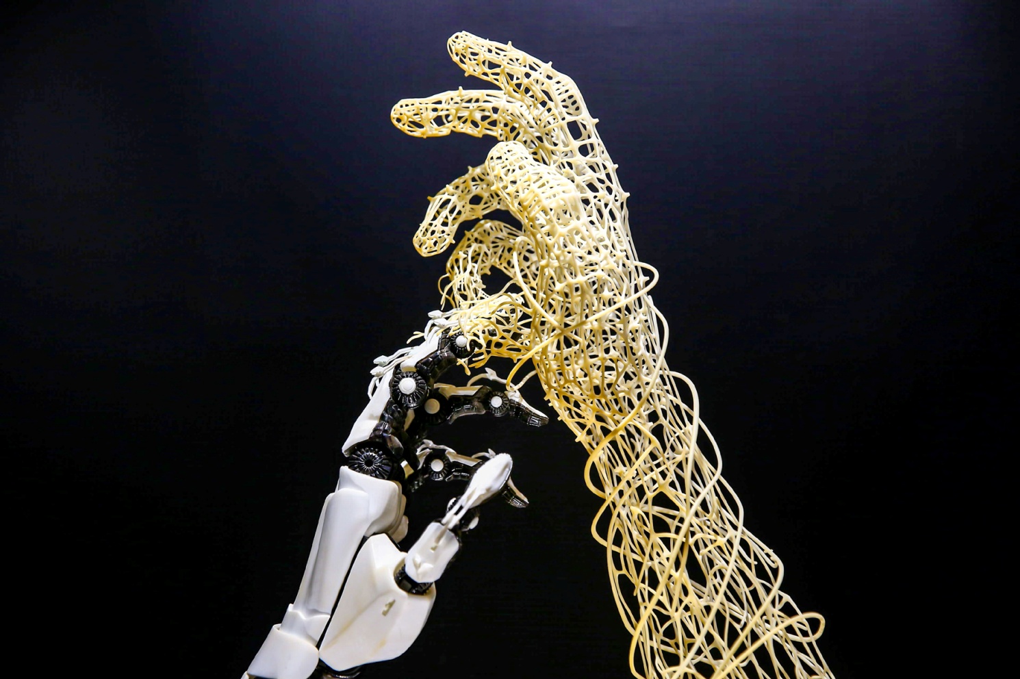 作品简介:以神经元连接成的一只人类手与一只机械手相互搭靠在一起,构成了一个 “人”字。两只手触碰在一起的地方,通过神经相互缠绕覆盖,仿佛机械被注入了新生的生命。