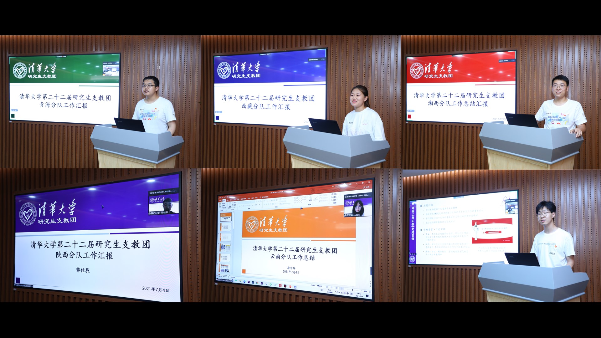 李沛桐、荆晓青、杨鹏成、蒋佳辰、唐若瑶(从左至右、从上至下)汇报各分队工作,郭魁星汇报培训工作(右下)