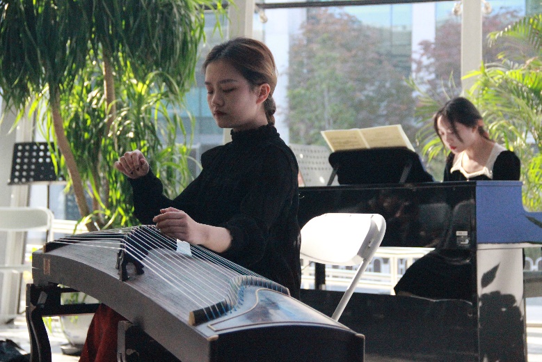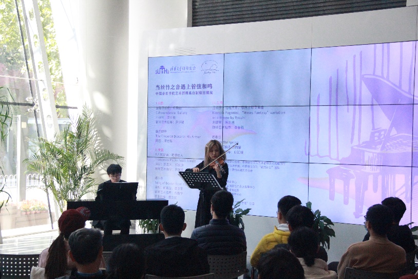 来自中国音乐学院的“破壳团队”依次为清华师生演奏了波隆贝斯库的《叙事曲》《霸王卸甲》以及F.P.托斯蒂的《理想佳人》等曲目,中国音乐学院艺术管理系2018级本科生陈泳如主持本次活动并作导赏讲解。本次展演分为家国、爱情和生命三个主题,每个主题下均有一首中西方的代表曲目。当丝竹之音遇上管弦和鸣,钢琴、小提琴等西方乐器与琵琶、古筝等中国传统乐器交融演奏,碰撞出中西文化和而不同之美,精彩的演出赢得了现场师生们的阵阵掌声。