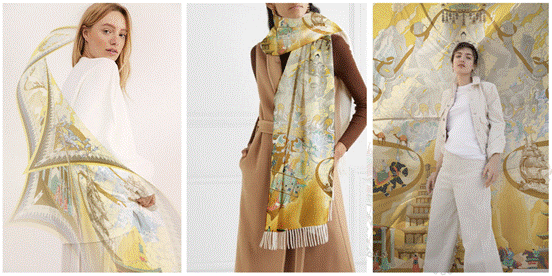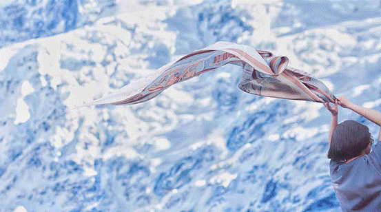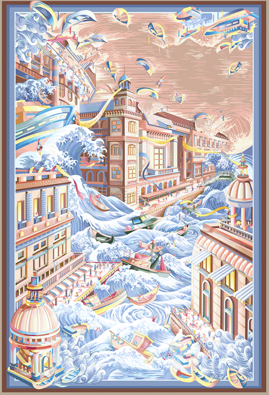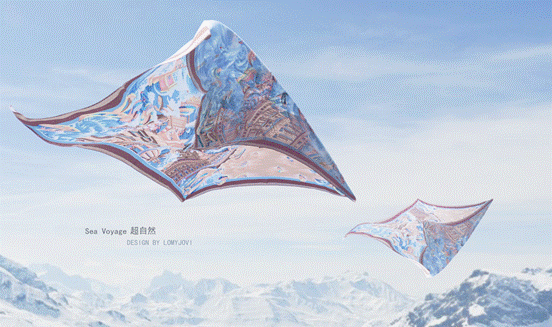 获奖作品《超自然》原创丝巾设计以大自然的灾难“海啸”为主题,以世界建筑遗产“威尼斯”为场景,构想人类污染大海后大自然的反噬席卷而来。小小的海洋垃圾,最终竟可以殃及人类文明,以此呼吁社会保护自然迫在眉睫。