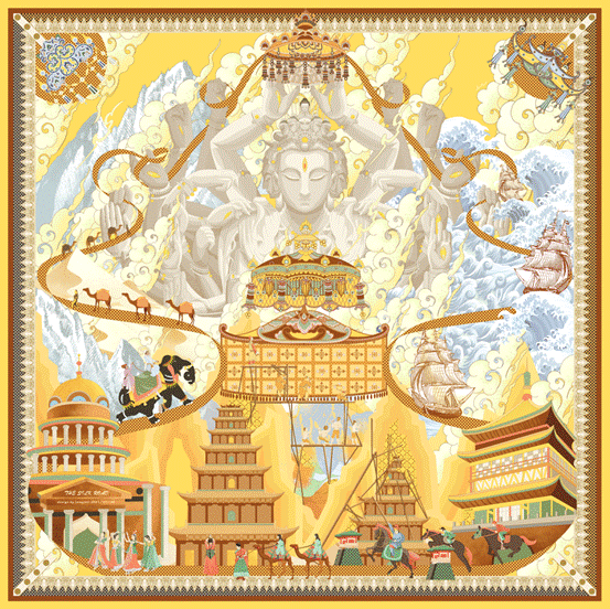 获奖作品《苍穹》以敦煌莫高窟壁画为精神寄托和灵感来源,将唐代长安至西域旅途,通过飘带状构图表现在方寸之间。作品重点诠释古人将精神寄托于壁画神像,为保佑旅途平安、给予精神支柱,因此画面中富含“正在刻画敦煌壁画”的画匠,有祈求庇护的供养人和神像与华盖,亦有经历各种地理条件的不同状态,最终都由敦煌精神支撑着旅人在极端恶劣的环境下最终抵达目的地,在展示敦煌美的同时,烘托敦煌精神之伟大。