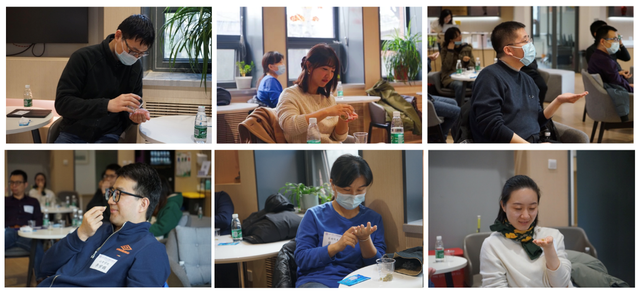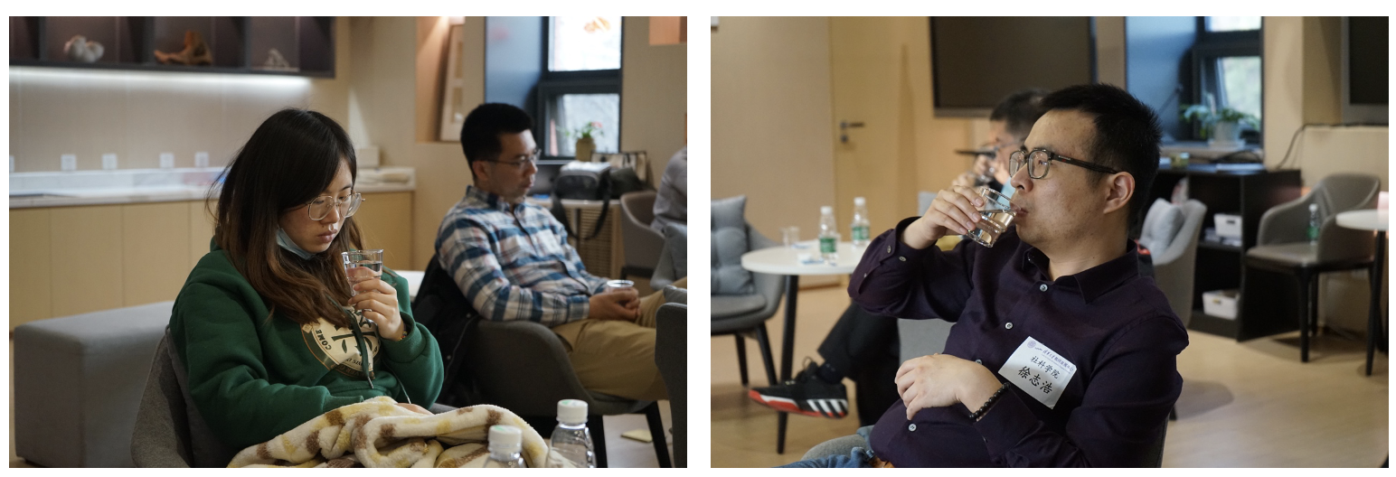 品尝结束后,“慢动作喝水”的活动再一次让参与者感受到了身体的变化。贾坤启发大家尝试暂停思考,而是去感受和观察,特别是在品尝水的过程中,感受水在身体中的流动。