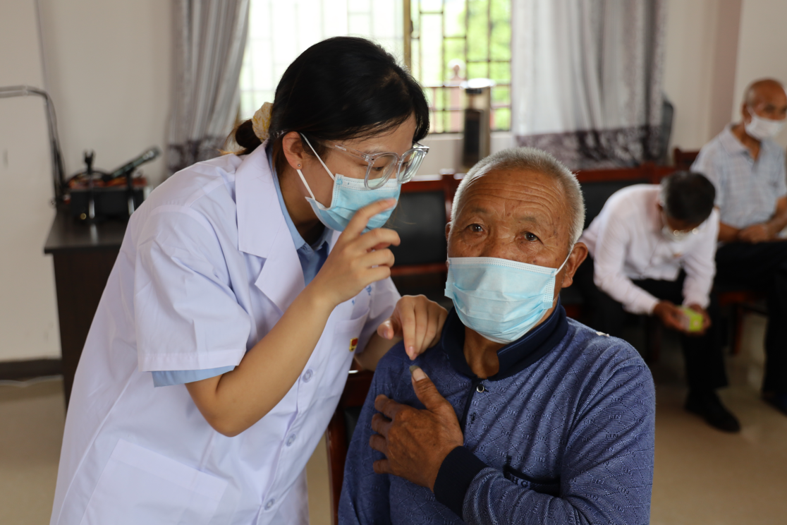 活动当天,队员们早早地来到义诊现场做好前期工作及疫情防控准备,一边为前来看病的群众进行登记、发放口罩、测量体温,一边维持现场秩序和引导分流。此外,支队通过前期调研发现,部分年老体弱、居住较远或行动不便的患者难以参与线下义诊,因此支队联合溆浦县中医医院多学科专家团队开展“送医上门”服务,深入患者家中,详细了解病史并进行体格检查,共同提出了可行性的指导意见,还对失明的高血压合并糖尿病患者进行了慢病宣教和健康科普等服务,将实实在在的温暖送到村民身边,得到村民的认可。