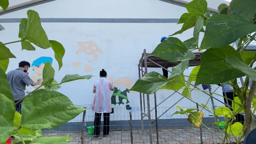 纸上作画可以几易其稿,而墙绘却要慎之又慎。队员们遇到的第一个难题就是七八月之交北方的雨季,实践开始前半个月,高阳多次请教有着丰富墙绘经验的学姐李雅宁,一同挑选颜料。安东回忆:“我们选择了最不容易被雨水冲刷的颜料——丙烯,它保持颜色的时间也比一般涂料要长;如果真的遇到大雨冲刷,我们也准备好了足够的塑料保护膜,在悬挂时既要起到保护作用,又不能贴得过近,以免刮蹭掉刚上的颜料。”