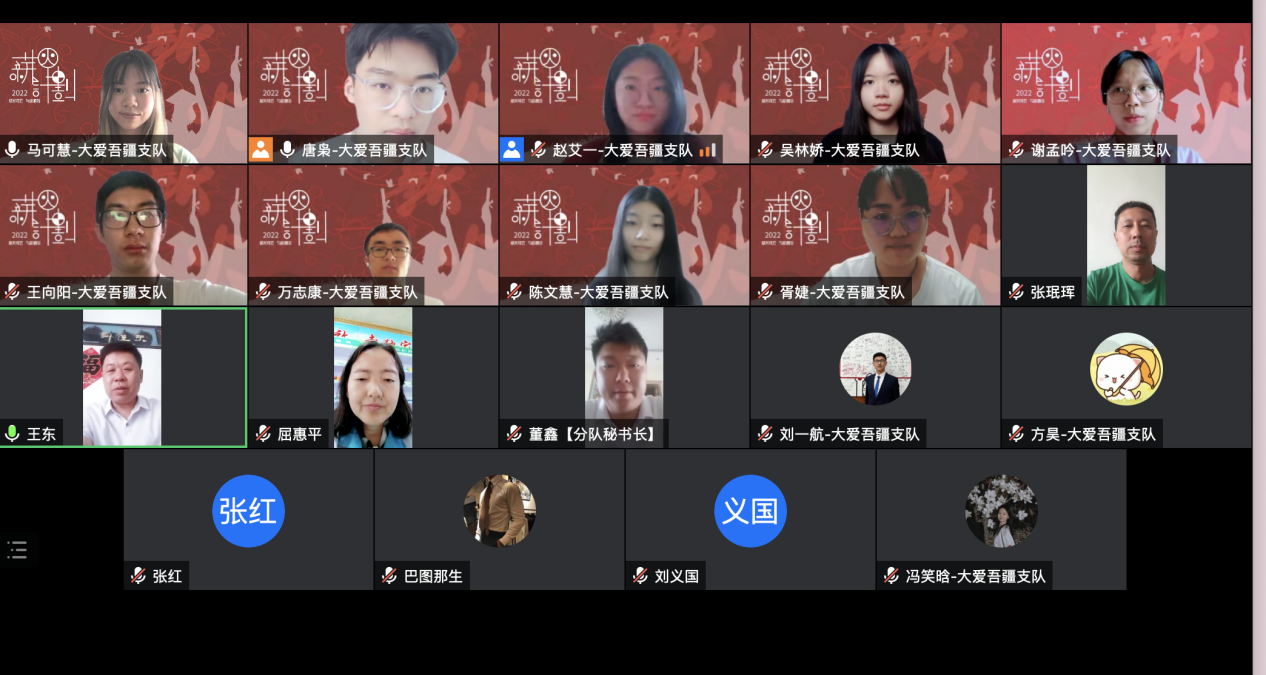 8月12日至8月14日,“大爱吾疆”支队的12名队员与库尔勒市绿丝带爱心车队、库尔勒市温暖阳光社会工作服务中心、库尔勒市新时代文明实践中心、西部阳光志愿服务队等当地志愿服务组织负责人进行线上交流,以“云实践”的方式探寻祖国的西北边陲,探究库尔勒市志愿服务及少数民族聚居区基层治理模式,探索城市志愿服务新思路。