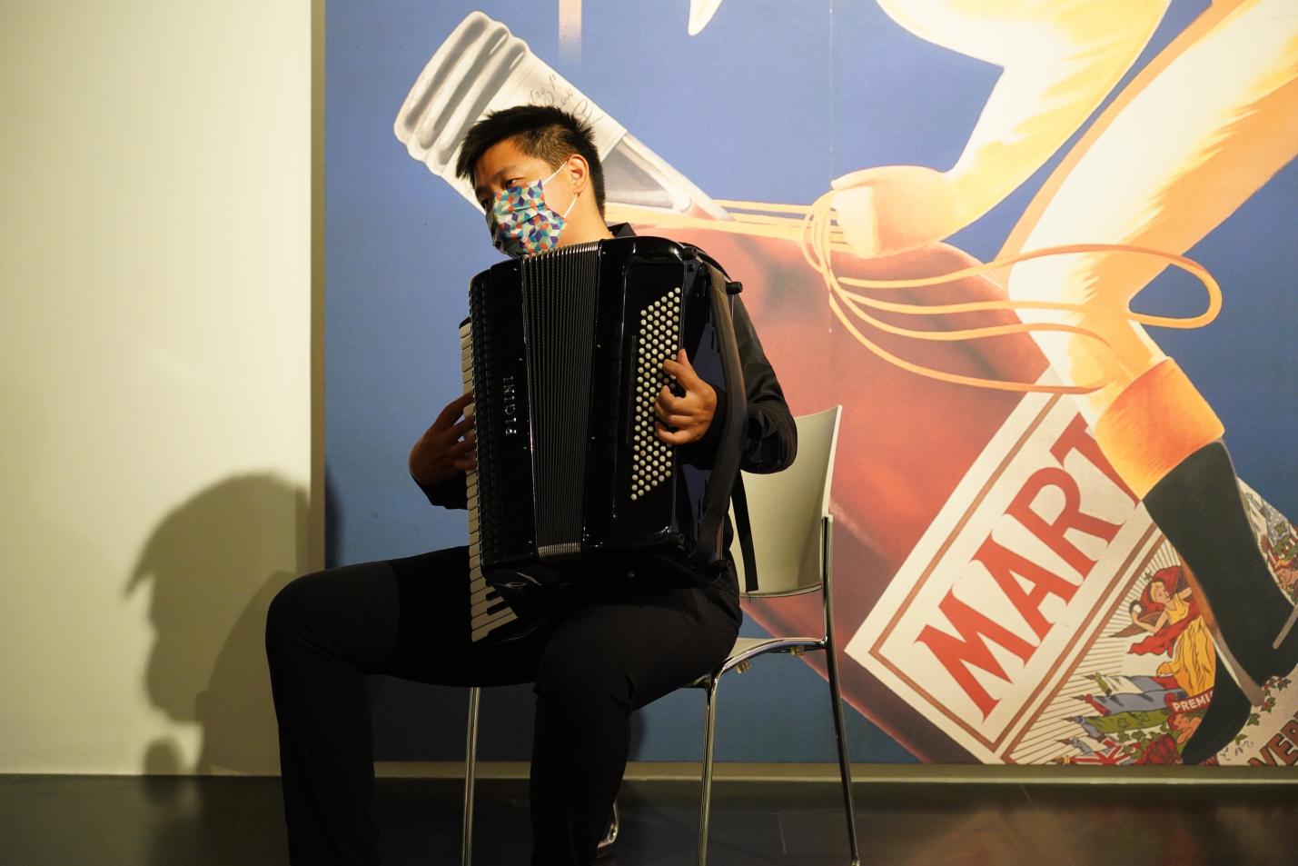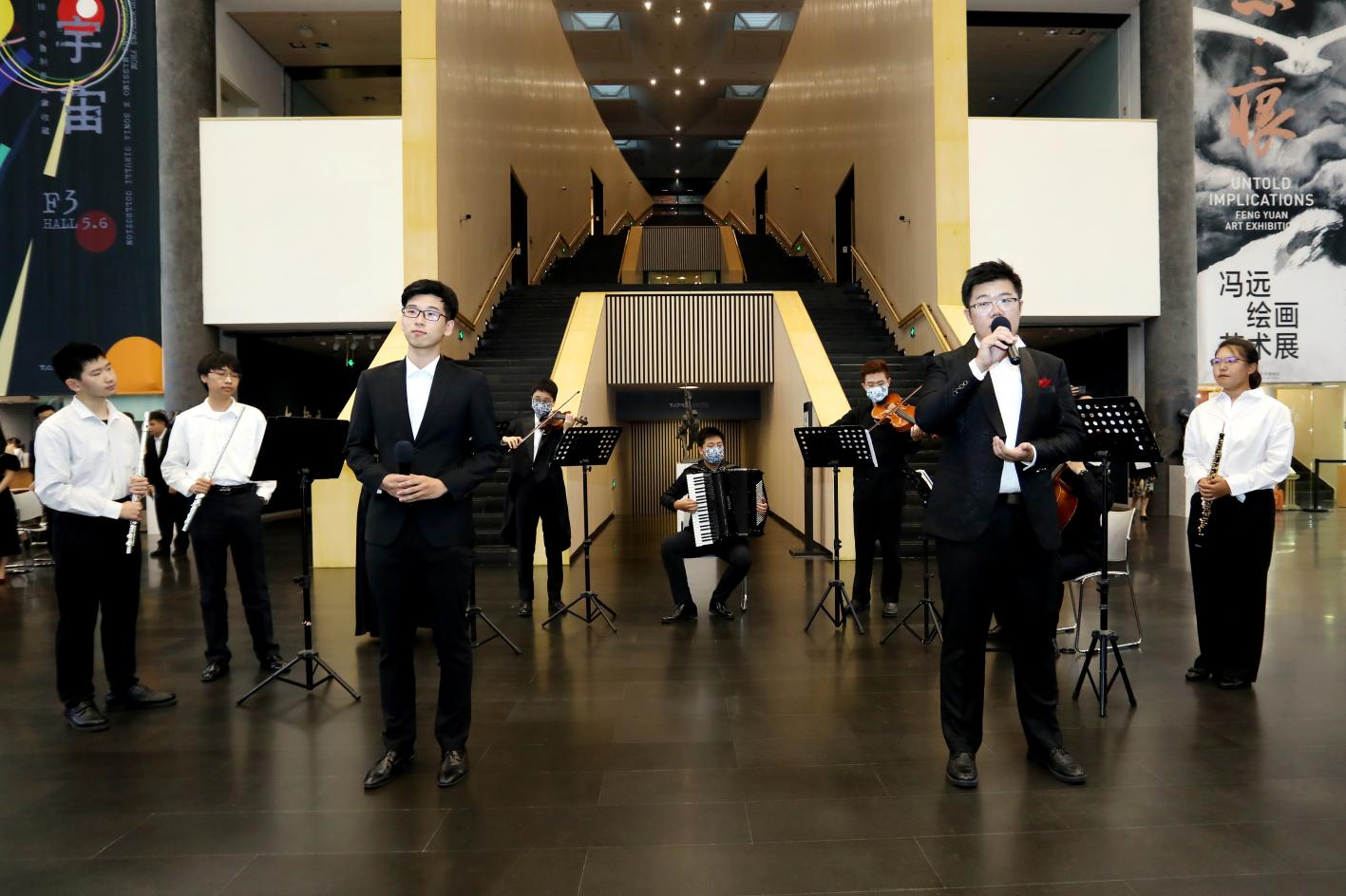 此后的晚场展览中,学生艺术团军乐队、交响乐队、合唱队、京剧队队员分别前往宇宙厅、温度厅、冯远厅,为观众带来一场场别样的音乐体验。交响乐队队员演奏的巴赫《大提琴无伴奏第一组曲》庄重典雅,莫扎特《小提琴中提琴二重奏》精巧灵动,军乐队带来的双簧管独奏《加布里埃尔的双簧管》深邃动人,长笛二重奏《千与千寻》细腻优雅。键盘队带来的手风琴独奏《安南探戈Anantango》别有风情,京剧队表演的《霸王别姬》刚柔并济,合唱队演唱的《但愿人长久》情意浓浓……时空交叠,旋律共振,现场观众伴着美妙的乐声,徜徉于艺术的海洋。