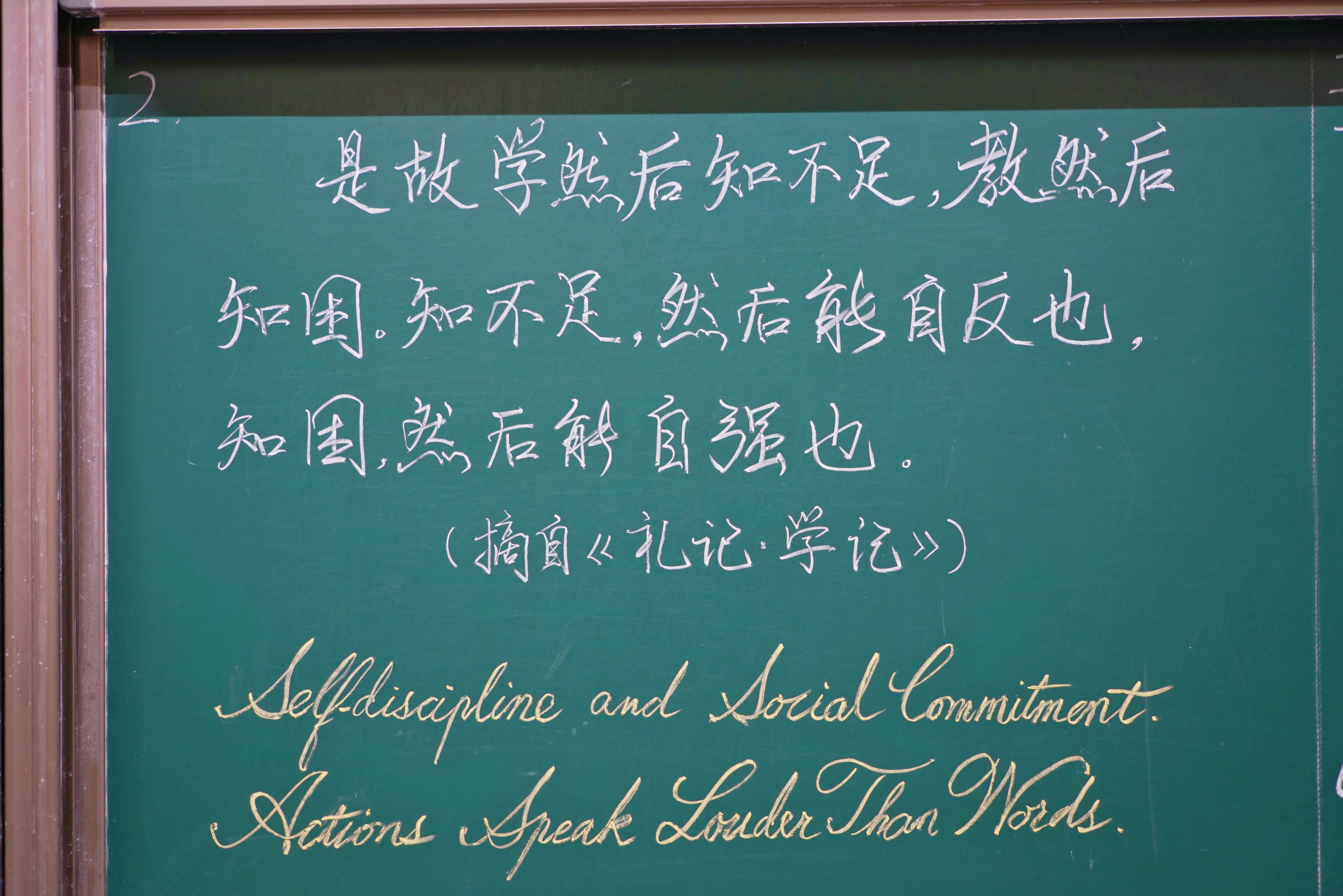 杜鹏飞在发言中表示,教职工粉笔板书比赛于2017年起举办,主要宗旨要突出书法的实用性、展示板书艺术性的重要作用。板书书写不仅传递了知识,也承载着中国文字特有的美。如果教师能够在日常教学中,能够关注一点,自觉提升一点,日积月累,做到板书整齐、规范、有美感,可以提升我们学子对于文字之美的认知。