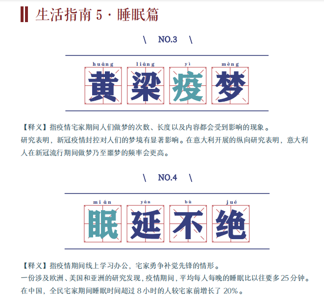 而在《健康手册》的“睡眠篇”里,一部分内容是以“成语谐音”的方式趣味化展示出来,例如“黄粱疫梦”“眠延不绝”“弃早贪黑”等等。负责这部分撰写工作的汪浩文说:“在简单直观的表达背后,是多部文献和研究成果的理论支撑。”