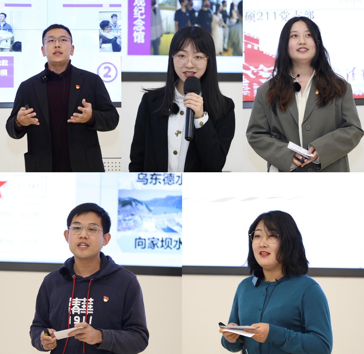 五位研究生党支部书记分别作主题分享(左上至右下:孙逸凡、吴茜、李雨函、杨晓通、卢卓)