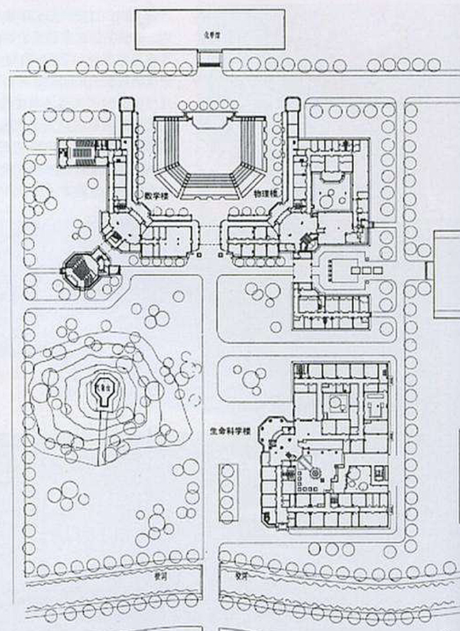 理学院区延续墨菲设计风格,以红砖墙为设计元素,建设理学院区,1999 年落成了15147平方米,具有连续室外拱形门洞长廊的"U"字形理学院楼和“一” 字形的化学馆构成“数理化” 三系,围合环抱着绿草如茵的下沉广场。