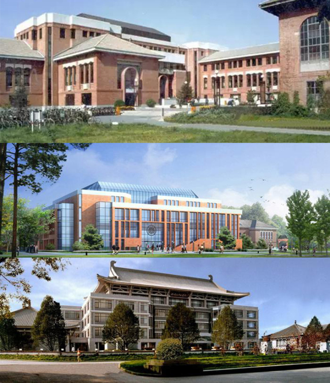 关肇邺和他一手设计的逸夫馆(上)、北馆(中)和北大图书馆(下)。
