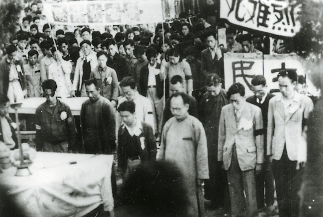 1945年“一二·一”运动中,潘琰(联大学生,党员)、李鲁连(联大学生)、于再(南菁中学教师,党员)、张华昌(昆华工校学生)牺牲,右图为四烈士公葬典礼。