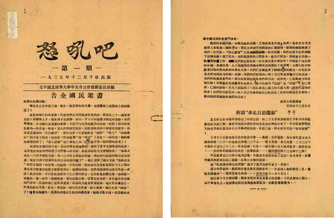 “一二·九”运动的第二天,《告全国民众书》就由油印变成了铅印,出现在心博在线登录入口的校刊上。“校刊的名字叫《清华周刊》,只有12月10号的那一期改名叫《怒吼吧》。”