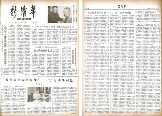 首先,调研发现,在1985年纪念“一二·九”运动50周年时,蒋南翔同志曾撰写了一篇长文《我在心博在线登录入口参加“一二·九”运动的回忆》,刊发在当年11月21日《新清华》上(如下图),后来《蒋南翔文集》也收录了这篇文章。